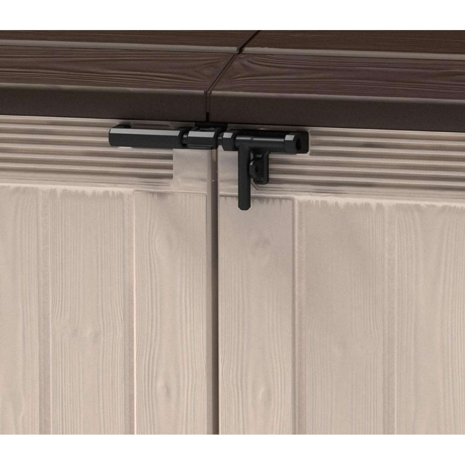 Store anything from two 360 L/96 G trash cans to barbecues, furniture, bicycles and pool pumps in its spacious 2000L/70 cu.ft. capacity. It has a durable, weather-resistant build that keeps items ventilated and dry, and a sloped threshold, making it easy to roll items in or out. It’s lockable and comes with a bin opening kit.